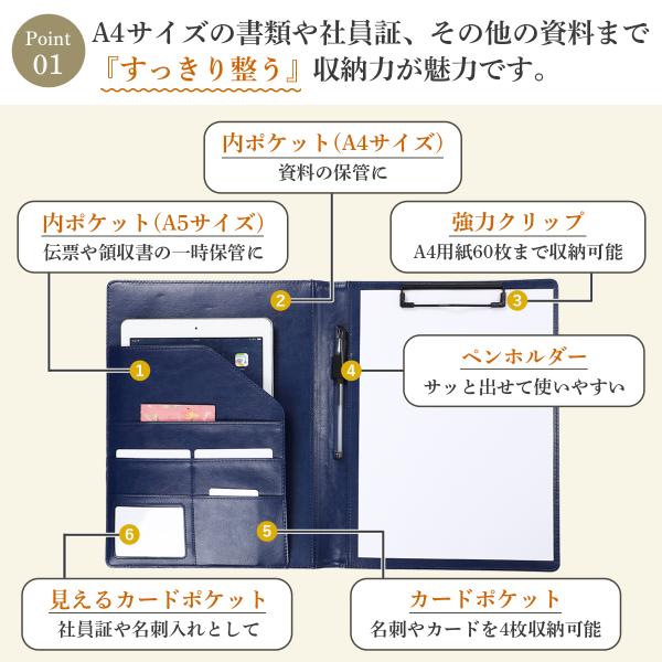 ・書類を60枚しっかり保持できる強力クリップ構造。カバー素材はPUレザーと本革の選択式で、ペンホルダーは細めペンに対応したコンパクト設計です。