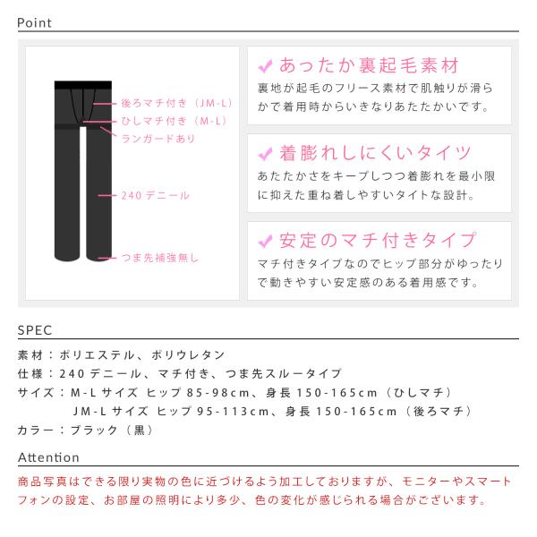 爆暖 裏起毛 240デニール タイツ マチ付き 黒 無地 ブラック 厚手 温活