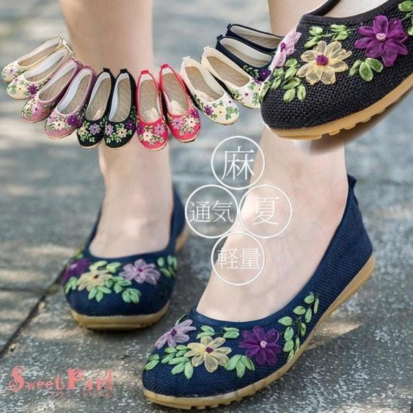 走れるパンプス レディース パンプス 麻 フラット シューズ 靴 痛くない 歩きやすい ぺたんこ 花柄 刺繍