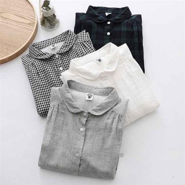 シャツブラウス襟付きレディース無地白シャツ長袖綿100%コットンギンガムチェックゆったりトップス丸襟