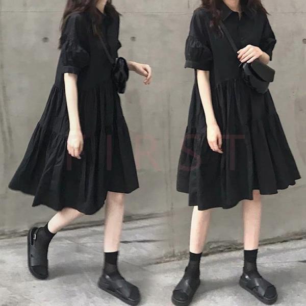 シャツワンピース レディース 40代 キレイめ 膝丈ワンピース 春夏 半袖ワンピース 黒フレアスカート シャツワンピ オシャレ 韓国風 ゆったり 大人可愛い30代