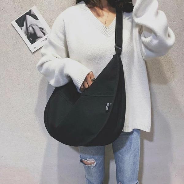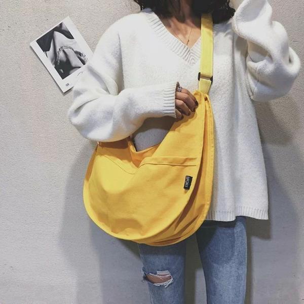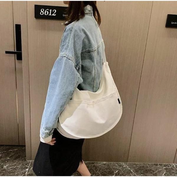 キャンバス生地がカジュアルでおしゃれな大容量三日月型ショルダーバッグです。