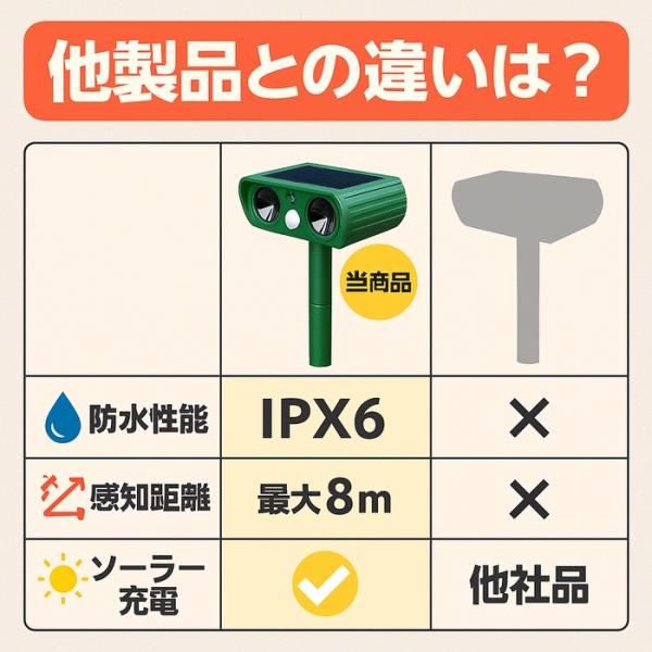 ・糞尿や荒らし被害の対策として効果が期待でき、無害設計の超音波は人やペットに安全です。防水・耐候性設計で雨の日でも安心して使えます。