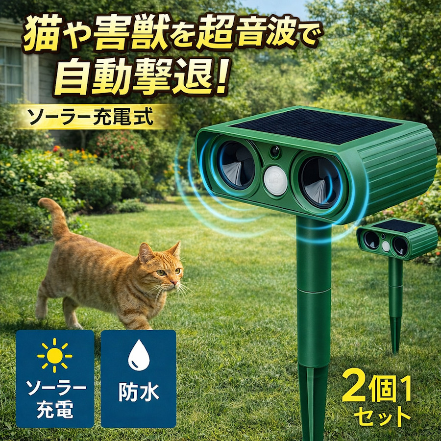 ・ソーラー充電対応の猫よけ、害獣撃退器2個セットです。太陽光で自動充電し電源不要で設置できるため、庭や畑・駐車場・ベランダなどの屋外スペースに最適です。