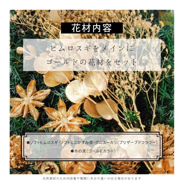 ヒムロスギをメインにゴールドの花材をセットしました。