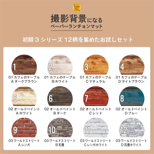 FrameCue 初期3シリーズ12柄お試しセット(12柄×各1枚)撮影背景になるペーパーランチョンマット A3 背景紙 ペーパーランチョンマット 撮影 バックペーパー