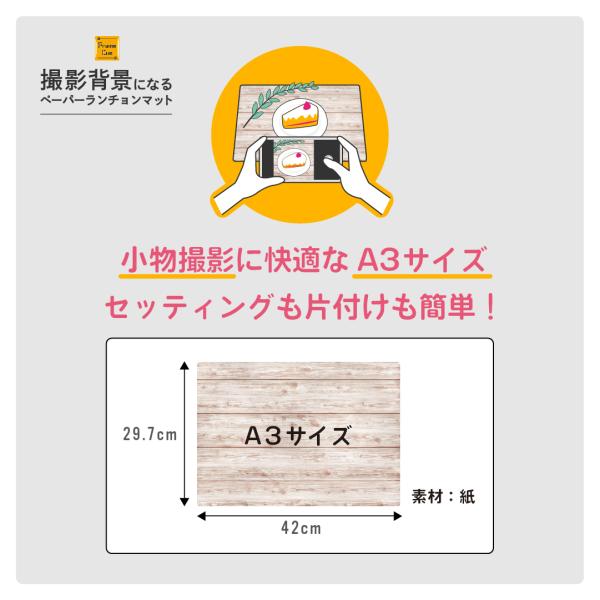 撮影現場で人気の木目やタイル柄の背景紙を家庭でも扱いやすいランチョンマットサイズにアレンジしました。アクセサリーやお弁当などご家庭での小物撮影に最適なA3サイズ背景紙です。敷くだけ簡単!いつもの写真がオシャレに変身します♪