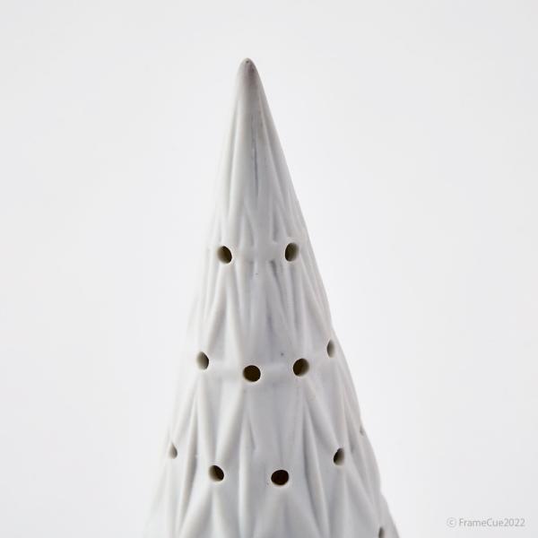 レース模様と降りしきる雪のようなドット模様が施された真っ白な陶器のLEDライト。
