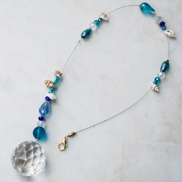 こちらは澄み渡る青の続く海をイメージしたカラーのガラスビーズと天然貝のビーズを使いました。