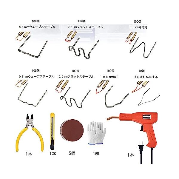 ・包装が完備 : 専用プラスチック溶接機1本、 溶接釘 600個、平らにするための溶接釘10個、ペンチ1個、 ツールカッタ1個、 作業用手袋1組、紙やすり5枚 、日本語の説明書1個。熱溶