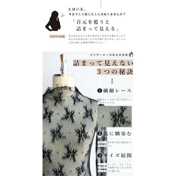 レースインナー インナーレース インナー 重ね着 レディース トップス クルーネック 長袖 襟元レース 着回し ストレッチ 伸びる 伸縮 二の腕 寒さ対策 花柄 刺繍 総レース レース 春夏 秋冬 パーティー 女子会 オフィス カジュアル お出掛け 旅行 大人女子 大人可愛い CAWAII 上品 きれいめ エレガントラフ ナチュラル S M L 2L 3L LL XL ぽっちゃり 大きいサイズ ブラック オケージョン パーティー 女子会 同窓会 結婚式 二次会 祝賀会 学校行事 入学式 卒業式 授業参観 保護者懇談会 三者面談