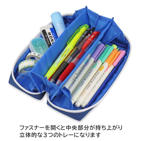 ファスナーを開くと中央部分が持ち上がり、立体的な3つのトレーになります。