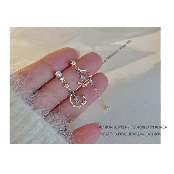 片方はパールとロングチェーンが優雅に揺れるデザイン、もう片方はビジューが輝く月と星のコンパクトなデザイン。