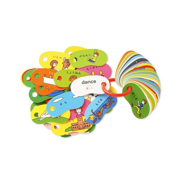 小さなカードを集めたわえい版のカード数は80枚!表に日本語とイラスト、裏にはそのものの名前が記され、あいさつ言葉から名詞まで、たくさんの言葉に触れることができます。