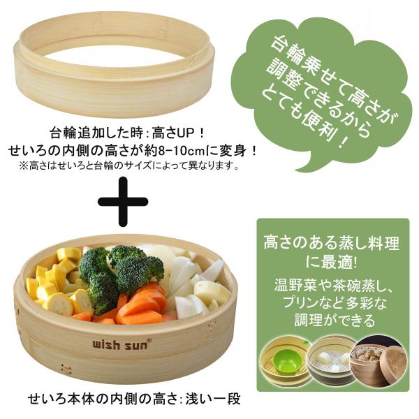 ご使用になる際は初めに水で濡らして下さい。 台輪をせいろに置くだけで、簡単に高さ調整が可能です。