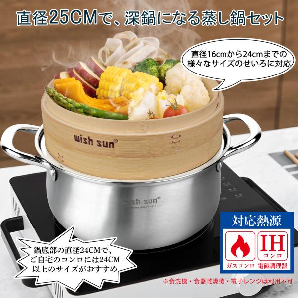蒸し板鍋セット 2点セット IH対応 ガス対応 直径25cm 18cm-24cmのせいろ対応 ステンレス せいろ マルチスチーム セイロ鍋セット 中華鍋 両手鍋 蒸し器 蒸し板
