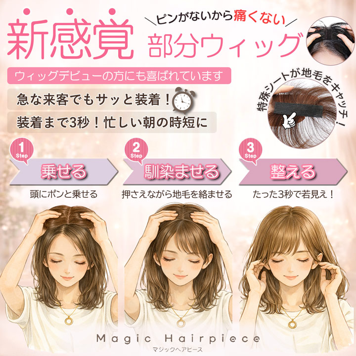 ピン無し 部分ウィッグ 前髪ウィッグ ウィッグ 白髪隠し ボリュームアップ 【マジックヘアピース 分け目タイプ 高品質耐熱ファイバー】