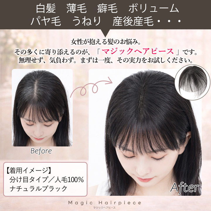 ピン無し 部分ウィッグ 人毛 前髪ウィッグ ウィッグ 白髪隠し ボリュームアップ 【人毛100% マジックヘアピース 分け目タイプ】