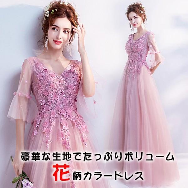 カラードレス カクテルドレス 長袖 安い ロングドレス イブニングドレス フォーマル ピンク フラワードレス 花嫁 発表会 結婚式 披露宴 演奏会
