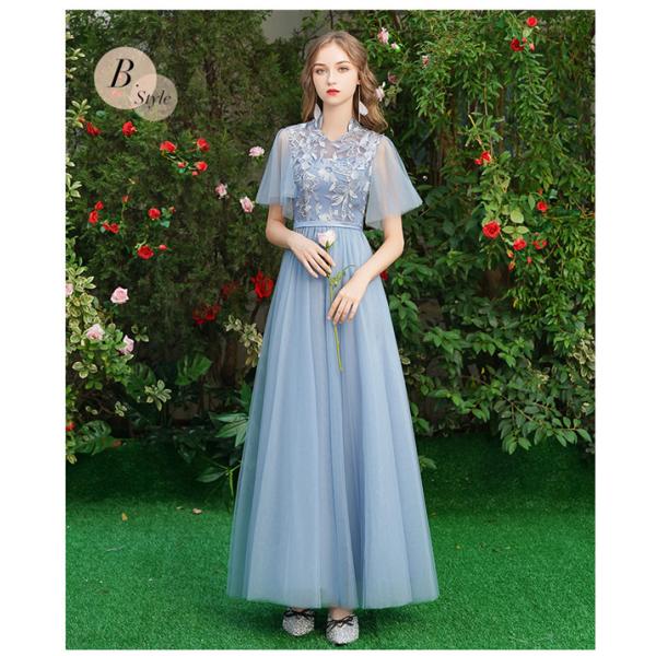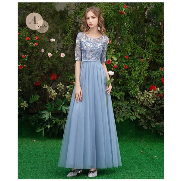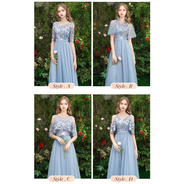 ブライズメイド ドレス ロングドレス 演奏会 4タイプ 袖あり 半袖 スピーカースリーブ 編み上げタイプ ブルー パーティードレス 結婚式 演奏会用ドレス ロング丈 大きいサイズ XL ドレス 大人 ピアノ 発表会 お呼ばれドレス ad022c0c0x0