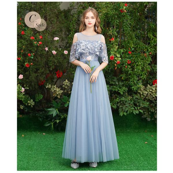 ブライズメイド ドレス ロングドレス 演奏会 4タイプ 袖あり 半袖 編み上げタイプ ブルー パーティードレス 結婚式 大人 ピアノ 発表会
