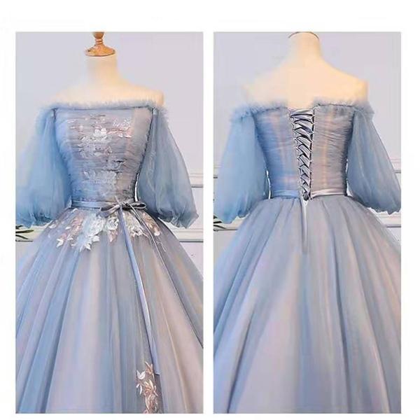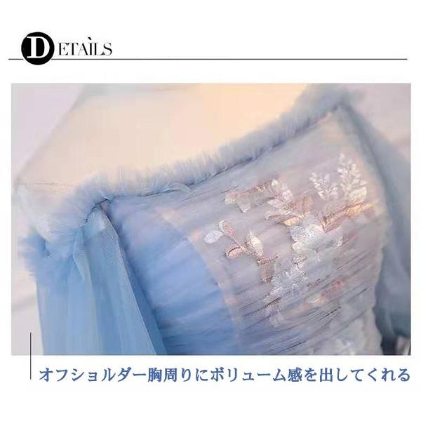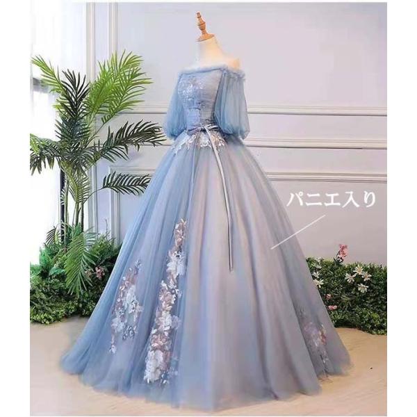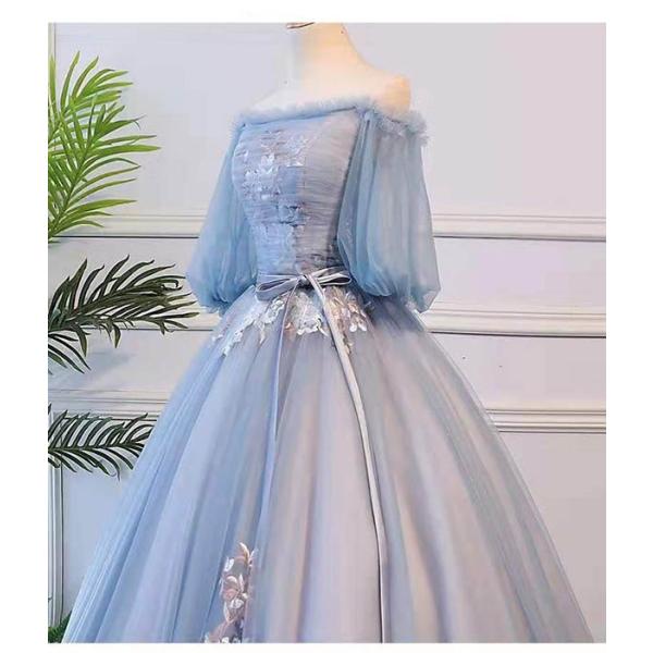 ロングドレス カラードレス 結婚式 袖あり オフショルドレス オフショルダー ライトブルー パフスリーブ バルーン袖 透け感 刺繍 パーティードレス 編み上げ プリンセスライン ポワン袖 イベント お色直し 結婚式 フォト婚 ピアノ 演出 舞台 ステージ 衣装 発表会 S M L XL 2XL da076x1x1x0