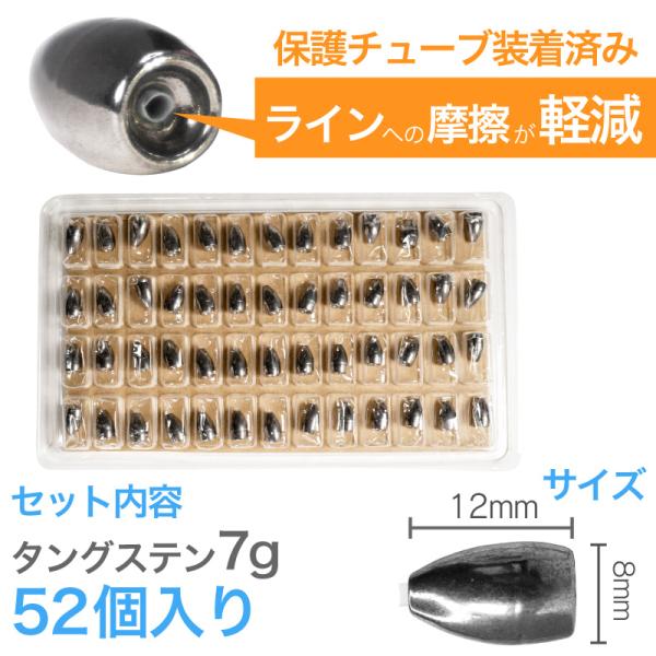 タングステン バレットシンカー TG シンカー 1/4oz 7g 徳用 52個セット 高比重 保護チューブ入り テキサスリグ ワームシンカー アジング チニング