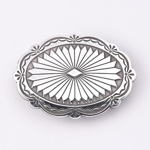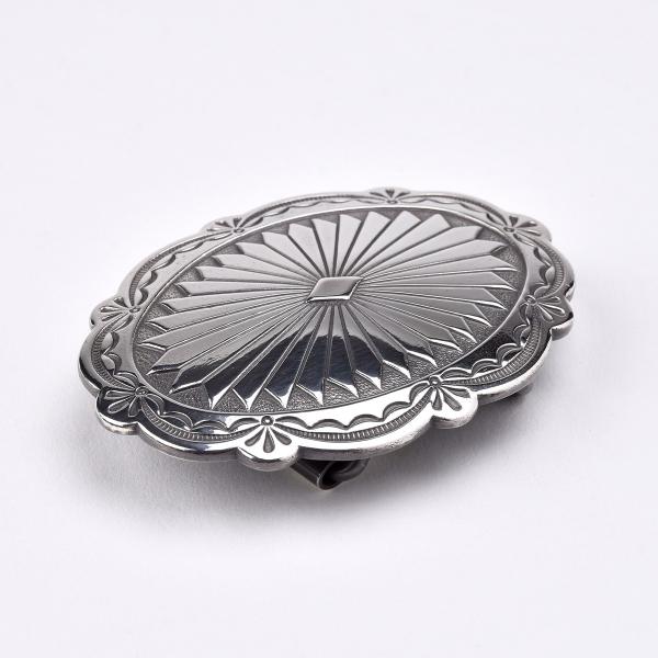 ダイヤ柄を中心に太陽の放射線をイメージしたナバホ族特有のサンレイデザインが規則的で美しく描かれています。シンプルですがシンメトリーな均一さと繊細な細工が際立つバックルです。