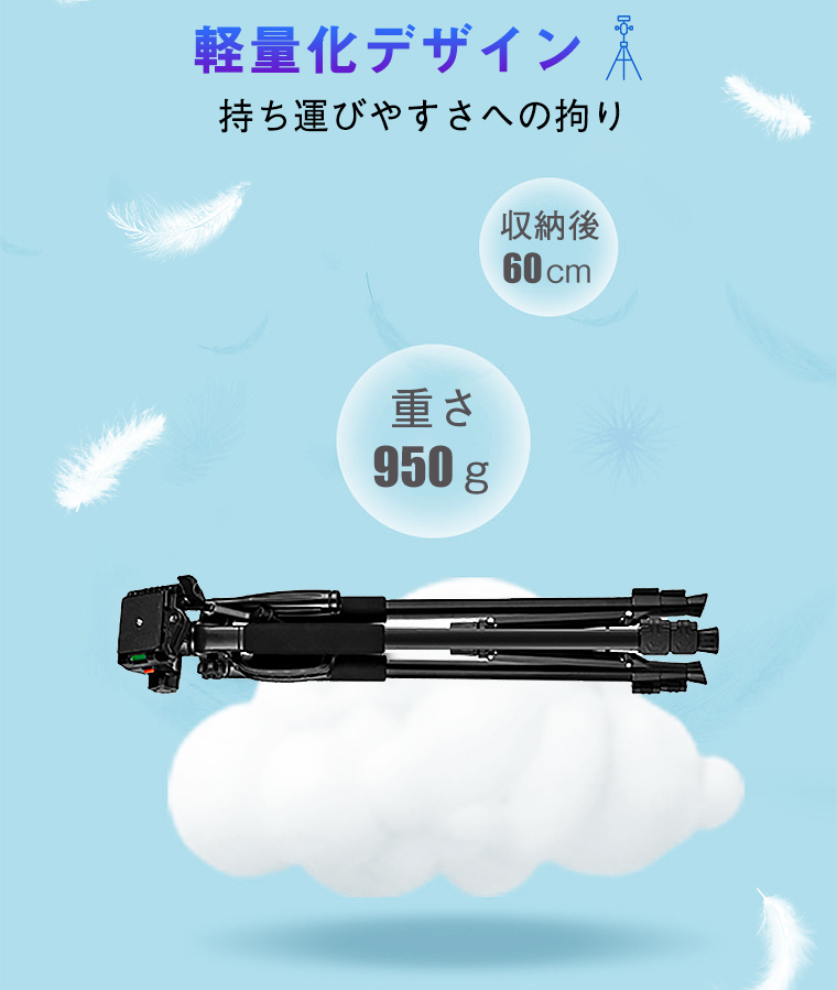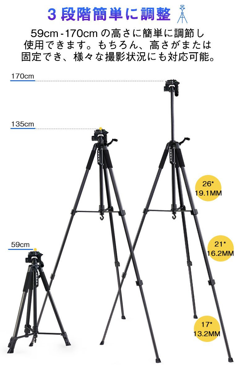 三脚は59cmから170cmまでお好みの高さに調節し使用できます。スマホクリップも付き、携帯電話の自撮りができます。もちろん、高さが簡単に調整し、または固定でき、様々な撮影状況にも対応可能。便利のために、収納袋も付属しますから、手軽に持ち運び、旅行、登山、歩行、イベントなどに大活躍!