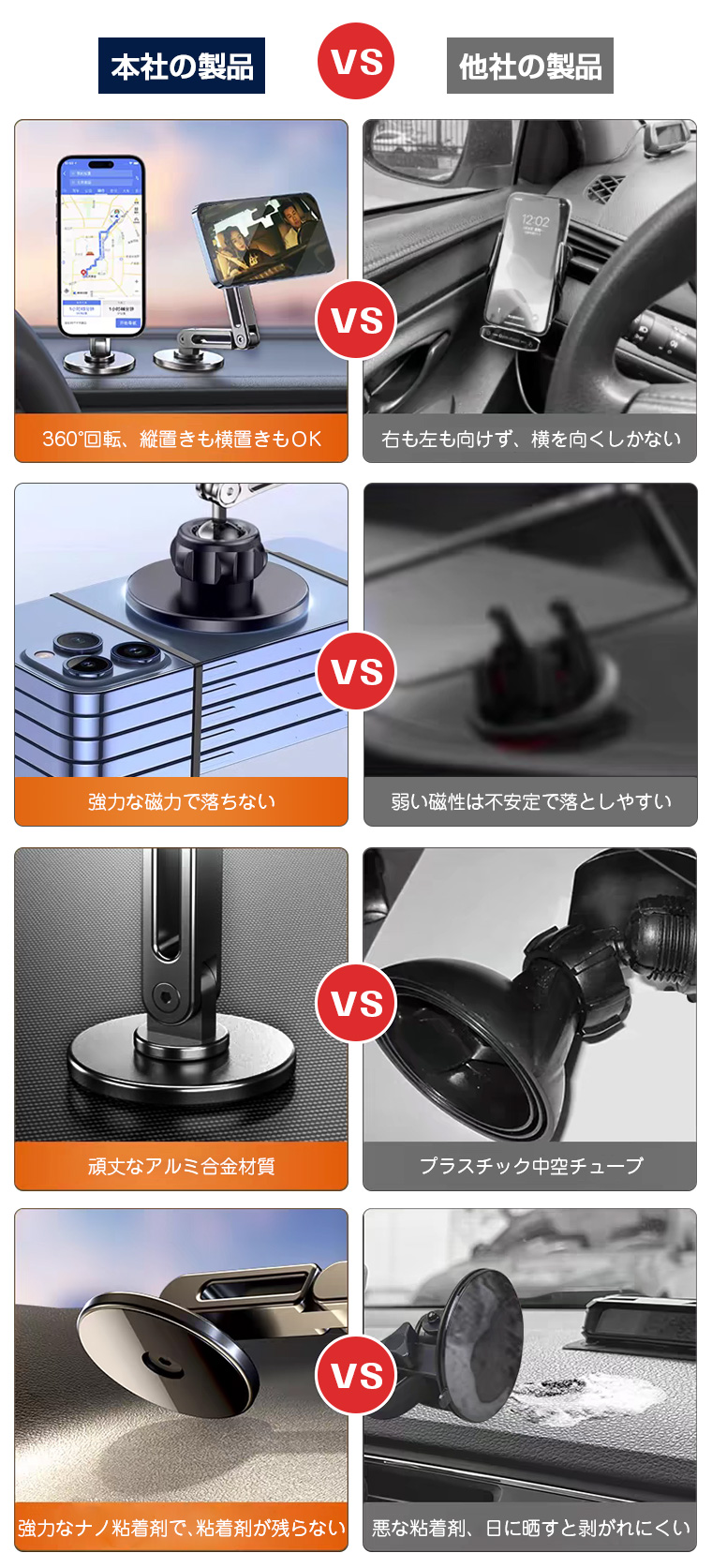 柔軟性の高い回転180°/360°ジョイントボールにより、携帯電話の位置をニーズに応じて快適/最適な角度に調整することができます。充電機能付きマグネット式車載スマホホルダーは、どちらも車内だけでなく、仕事や料理など車外でも使用可能です。