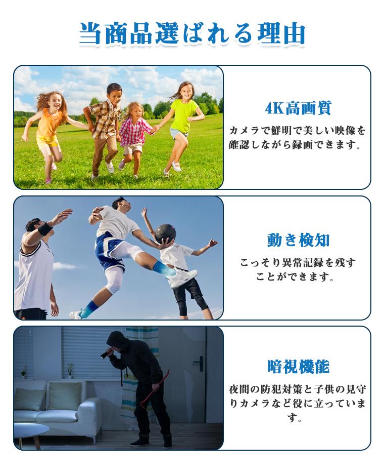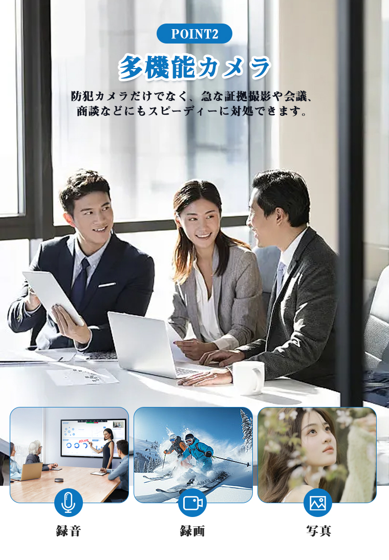 防犯目的やオフィスでの会議商談の記録に役立ちます。旅行時のハンディカメラだけでなく、車内カメラとしても利用可能。