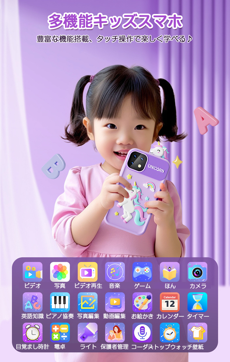 スマホで遊びながら楽しく反応力・想像力を育てます。通常のスマホと違い、遊びながら学べます。
