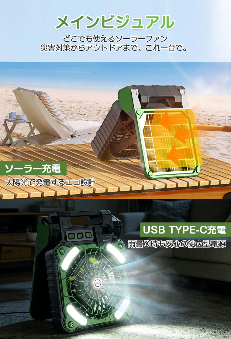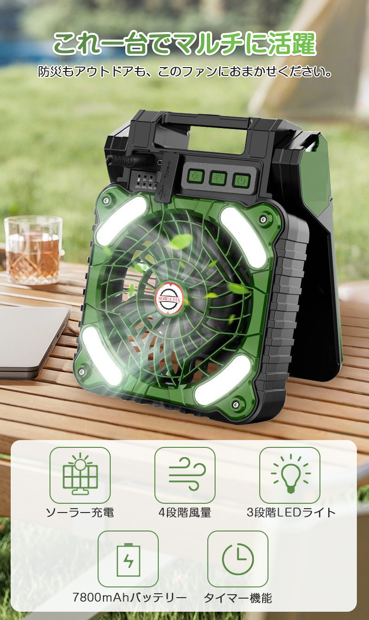 【7800mAh】扇風機 キャンプ ソーラーパネル扇風機 ソーラー 太陽光 充電 小型扇風機 ソーラーファン 吊り下げ 折り畳み アウトドア タイマー LEDライト