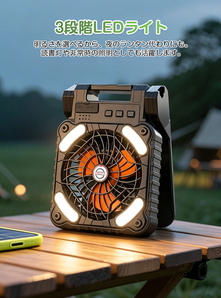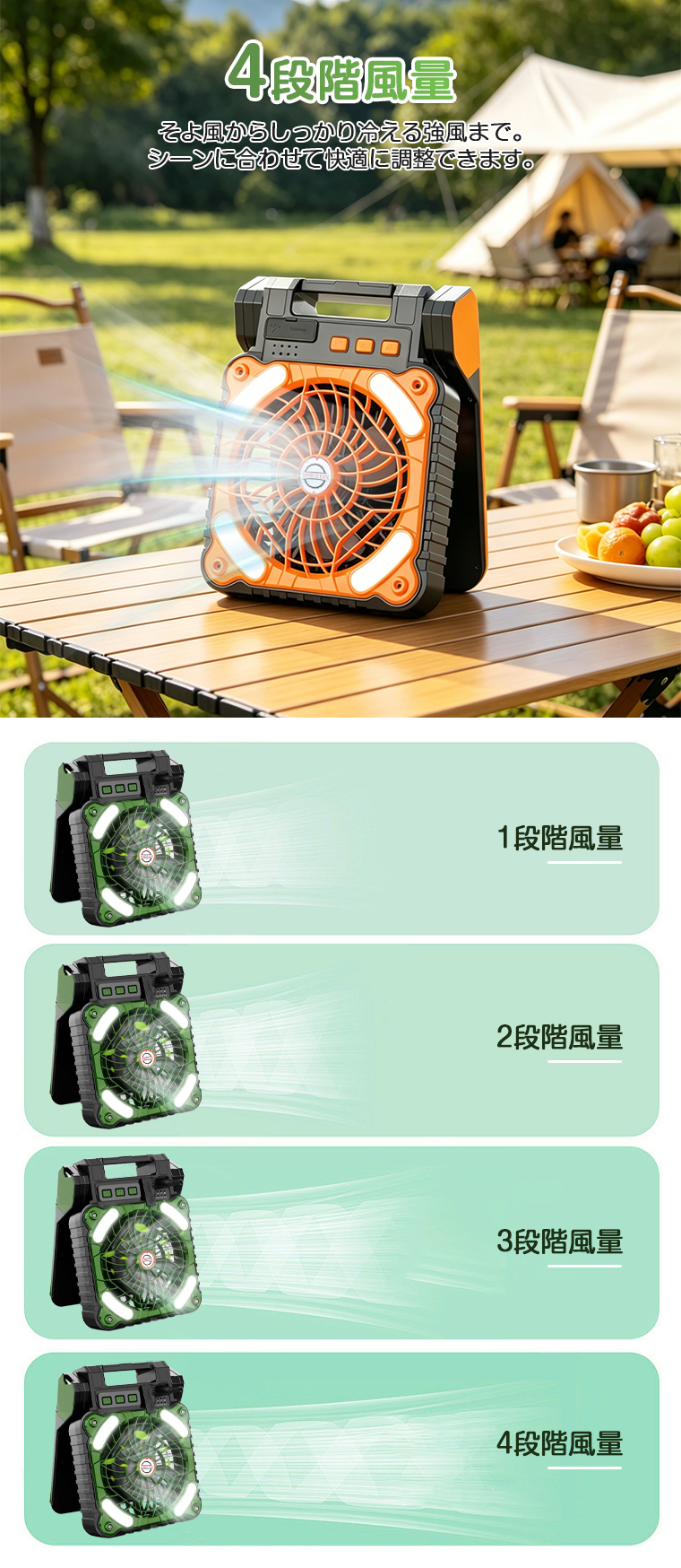 微風から強風まで4段階。LEDライトは3段階調節可能で、夜間や停電時に便利。