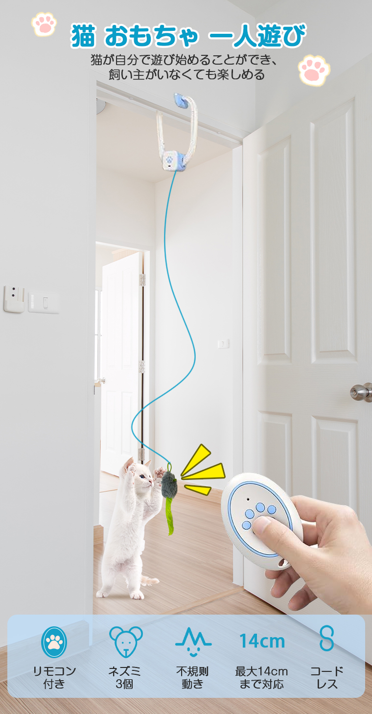 【ドア枠に挟んで】猫 おもちゃ 一人遊び 電動 電動猫じゃらし 吊り下げ 飛ぶネズミ おもちゃ 多機能 自動 猫じゃらし リモコン付き ネコ おもちゃ 人気 お留守