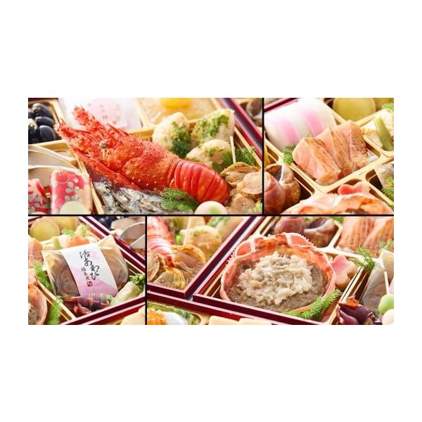 金箔黒豆/彩り金平糖/さつまいも金団/甘栗甘露煮/鰆昆布〆/紅白なます/友禅包み(黒豆さつまいも新丈)/ロブスター旨煮/若鶏黄味焼き/田作り/帆立串焼き/彩子毬/梅麩