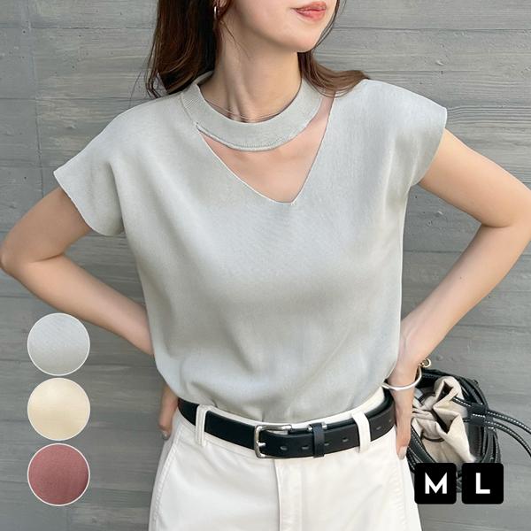 半袖 サマーニット チョーカー アシメ アシンメトリー トップス Tシャツ Vネック ひんやり オフィスカジュアル/ アシメスリーブチョーカーネックトップス