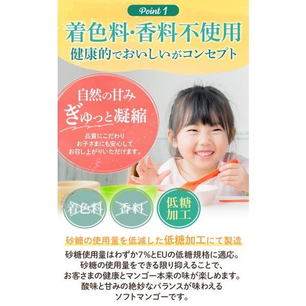 人の五感で一粒ずつ選んだこだわり製法 現地スタッフが毎日一粒ずつ触って匂いを嗅いで繰り返し熟度を確認した完熟マンゴー使用。柔らかく、香りが残り実を痛めない低温での乾燥作業をするこだわり製法