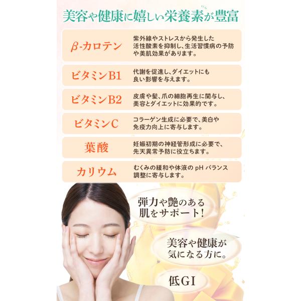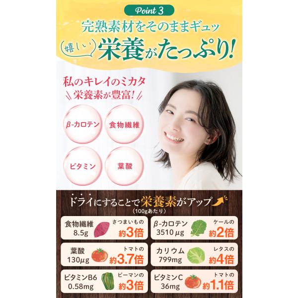 嬉しい栄養がたっぷり ドライにする事で栄養がアップ、食物繊維はさつまいもの3倍、葉酸はトマトの3.7倍、ビタミンB6はピーマンの3倍、β-カロテンはケールの2倍、カリウムはレタスの4倍、ビタミンCはトマトの1.1倍と他の野菜と比べても栄養満点です。