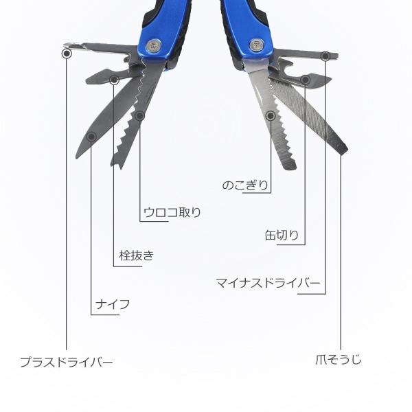 15-in-1 :多機能ツール:ニードルノーズプライヤー、レジュラープライヤ、ワイヤーストリッパー、リリーシングフック、鱗取具、プラスドライバー、マイナスドライバー、栓抜き、ナイフ、缶切り、ヤスリ、定規(インチ表記)、爪やすり、爪そうじ。