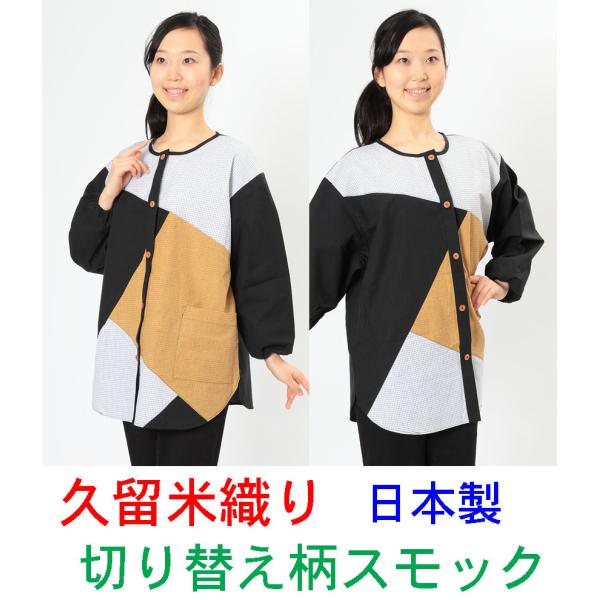 スモック 大人用 久留米織りの切り替え柄でおしゃれな スモックエプロン 日本製 前開き