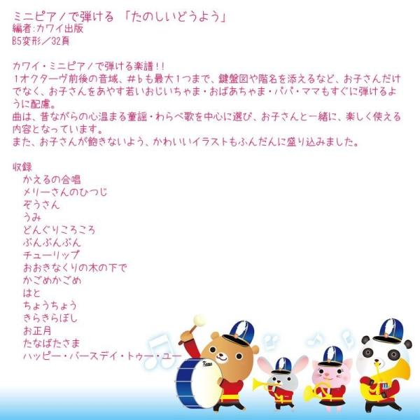 カワイ・ミニピアノで弾ける楽譜!!1オクターヴ前後の音域、#♭も最大1つまで、鍵盤図や階名を添えるなど、お子さんだけでなく、お子さんをあやす若いおじいちゃま・おばあちゃま・パパ・ママもすぐに弾けるように配慮。曲は、昔ながらの心温まる童謡・わらべ歌を中心に選び、お子さんと一緒に、楽しく使える内容となっています。また、お子さんが飽きないよう、かわいいイラストもふんだんに盛り込みました。
