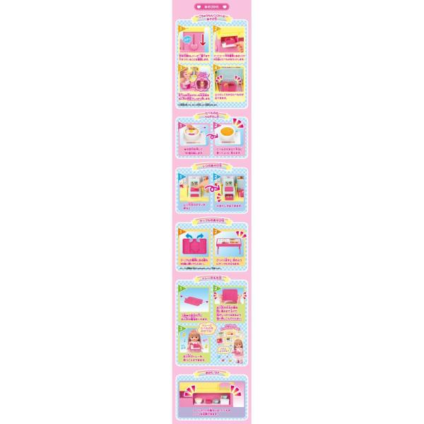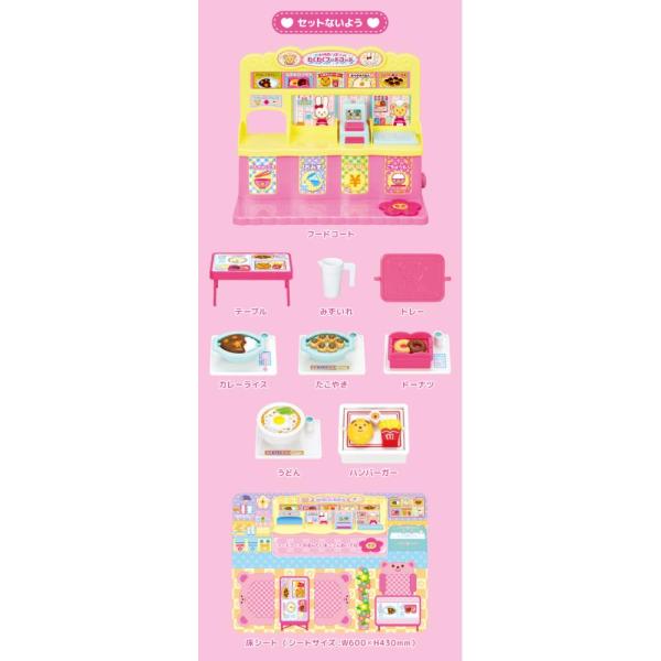 フードコートでおしょくじしましょ。たべものパーツをセットしてお花のボタンを押すと、たべものが下からでてきます。たべものは全部で5種類。裏返すと食べたようにみえるギミックつき。レジは、ボタンを押すとひきだしが出てくるよ。テーブルにおしょくじをおいて、いただきまーす!