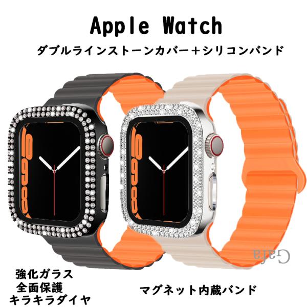 アップルウォッチバンドカバーセット Apple watchベルトカバー一体型 シリコン ダイヤ強化ガラスカバー 40 41 42 44 45 46 49mm