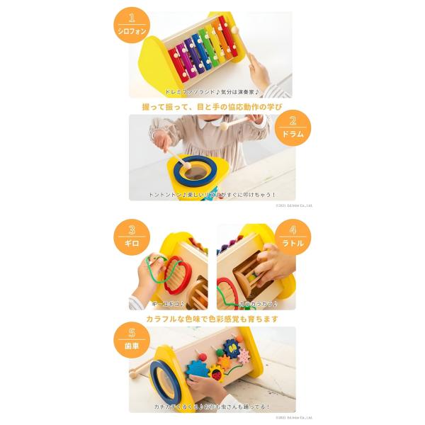 出産祝いや誕生日プレゼントに大人気の楽器のおもちゃ。ドラム・シロフォン・ギロ・ラトル・歯車の子どもが大好きな5つの音が楽しめる木のおもちゃです。「たたく」「回す」「こする」という動作から音が出る楽しさを自分で発見し、音の違いも自然に理解していきます。音あそびを通して、音感を優しく、情緒を豊かに育みます。さぁ、いろんな音を体いっぱい感じてみましょう。<br />