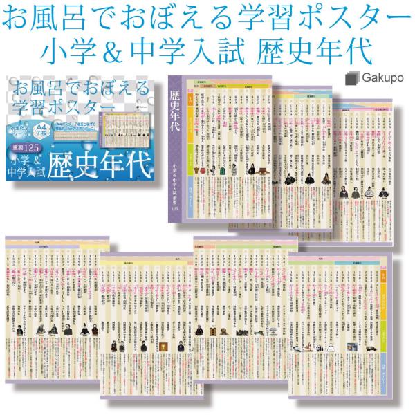 Gakupo お風呂でおぼえる学習ポスター 小学&中学入試 歴史年代 重要125 A4ポスター7枚セット 中学受験 社会 歴史 防水 教材