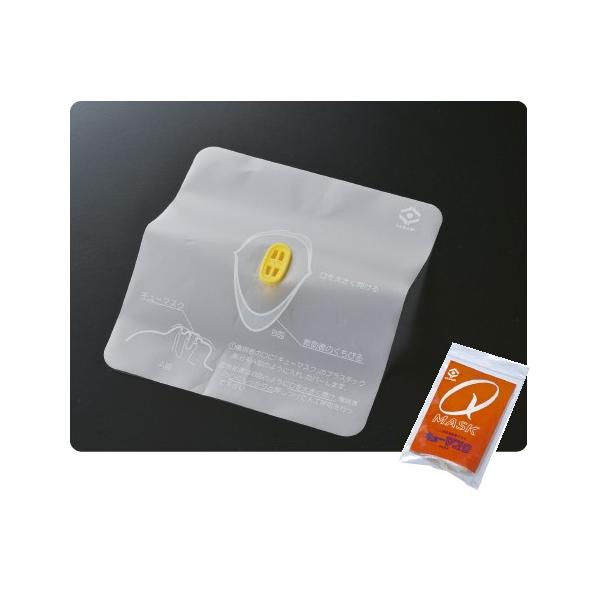 キューマスク/キューマスクfは、傷病者からの呼気などを逆流させない一方向弁と口への直接接触を防ぐソフトな感触の半透明シートを組み合わせた、人工呼吸時の感染予防補助用具です。装着しやすいマウスピース(一方向弁内蔵の突起部)は、マスクのズレを防ぎ、模擬人体や傷病者への確実な人工呼吸を可能にします。
