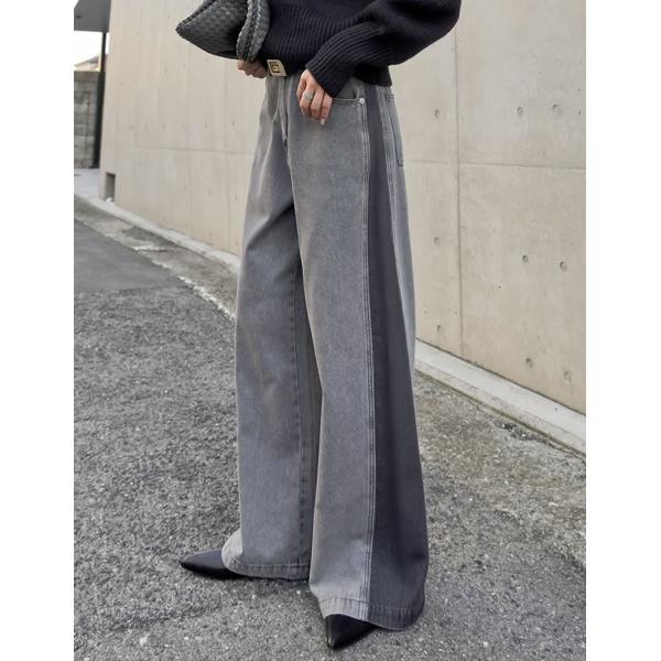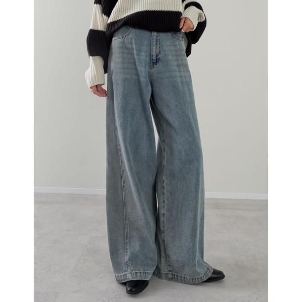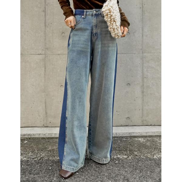 デニム ワイドデニム レディース 4色 低身長 高身長 パンツ ヴィンテージ風 加工デニム 配色 ウォッシュ加工 秋冬