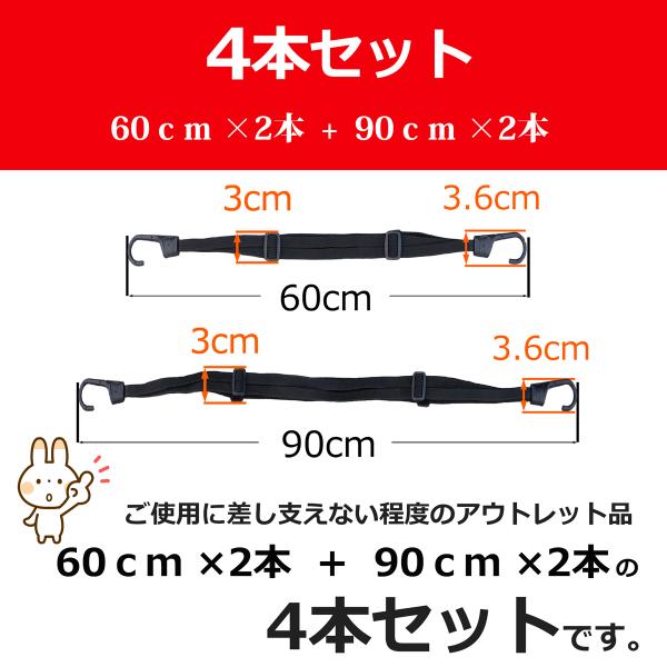 荷台ゴムひものアウトレット商品、60cmサイズ2本と90cmサイズ2本の合計4個セットです。