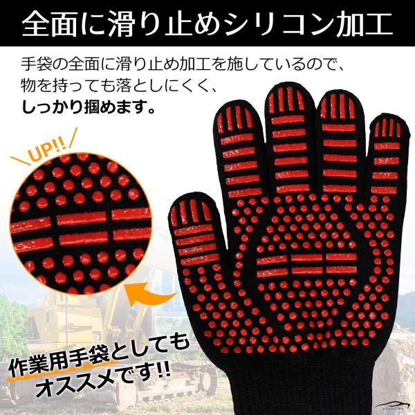 超耐熱性能を持つアラミド繊維を使用。専用設計の2重構造にすることで優れた耐熱性、防刃性を実現し、より安全な作業ができるように滑り止めのシリコンラバーを表面に加工しています